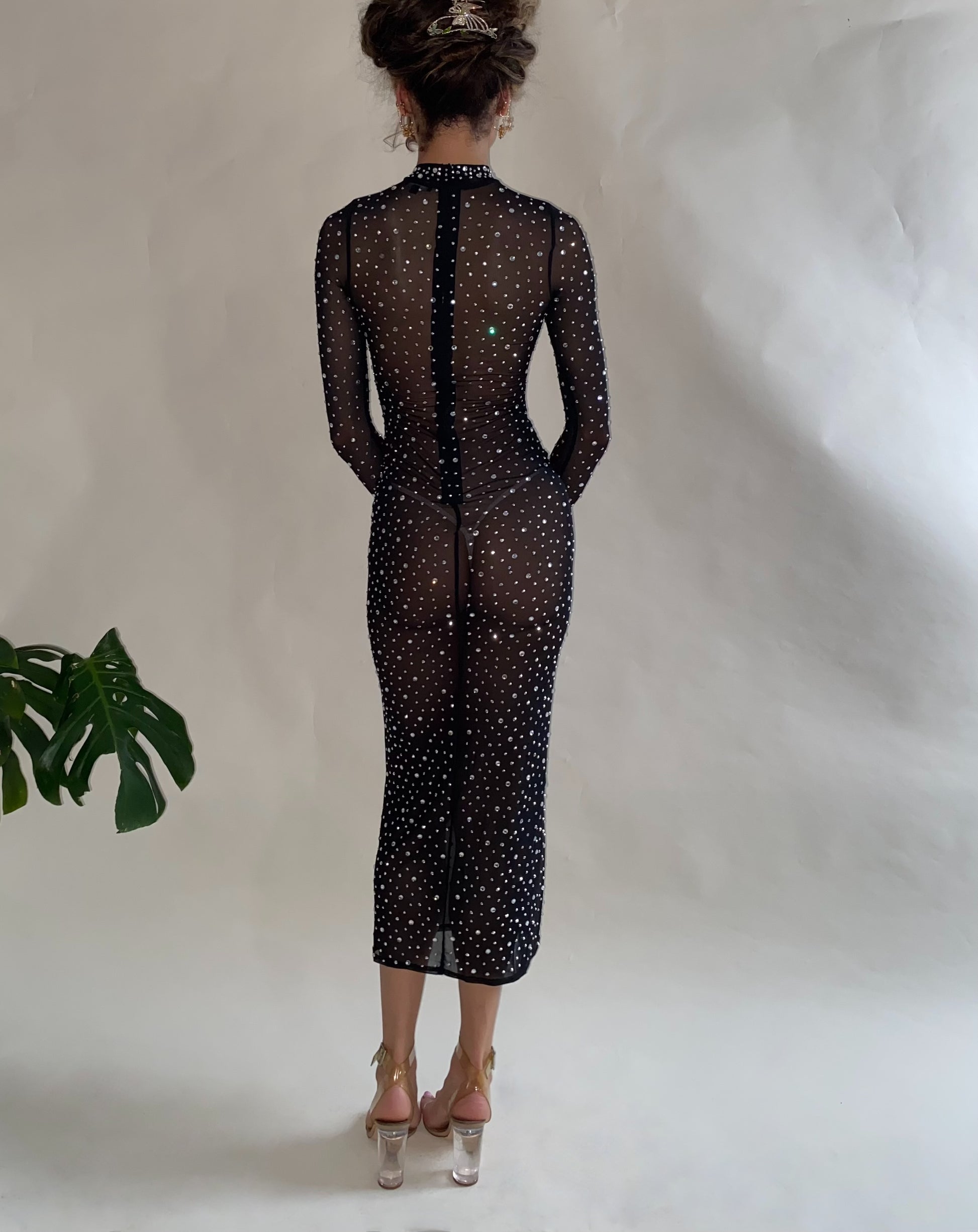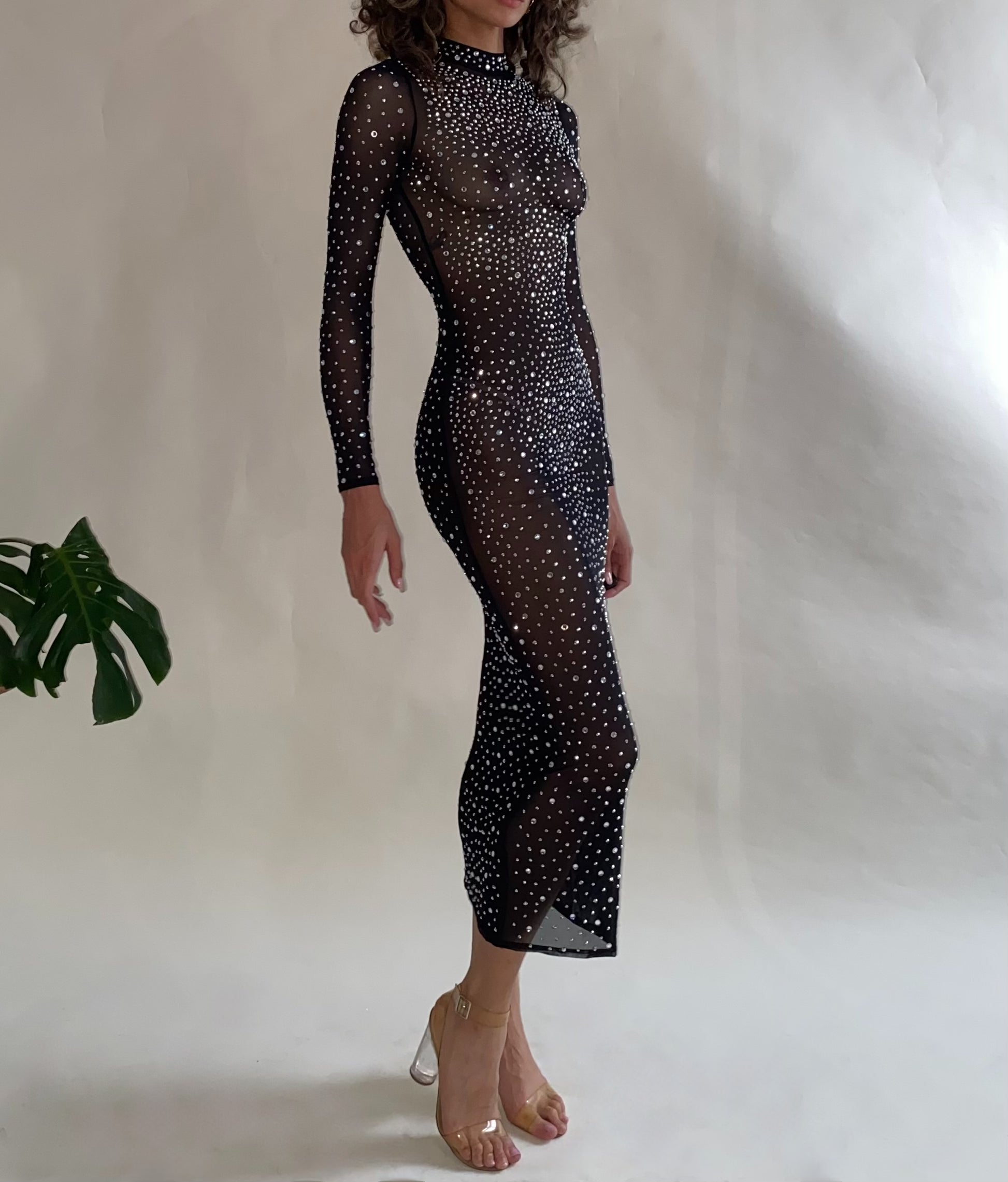 Long sleeve maxi dress covered in hotfix rhinestones of multiple sizes. Long back zipper, mock neck fit